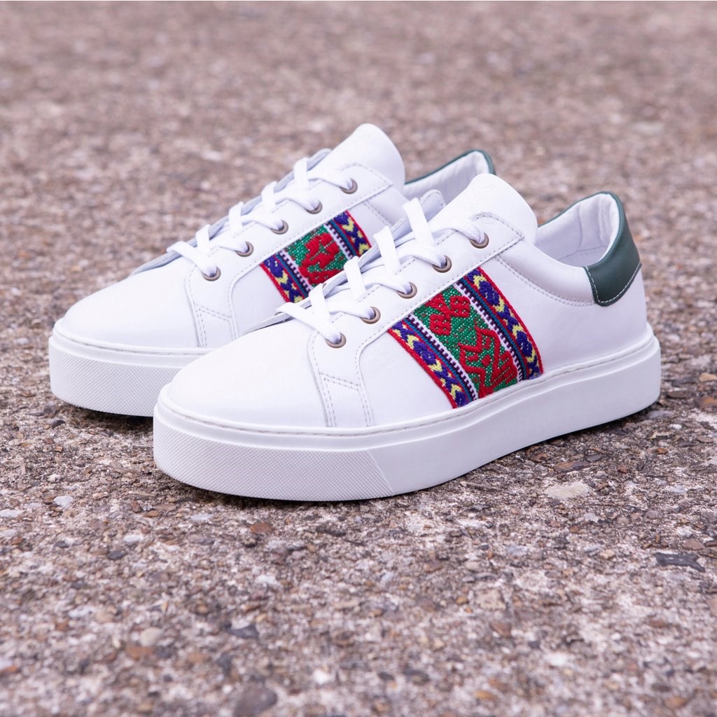 Perus, modèle Altiplano Esmeralda : On adore la touche originale avec les motifs Incas (tissus au Pérou par des artisans) sur la base d’un design à la fois classique et stylé qui fait penser aux Adidas Superstar ou aux sneakers Alexander Mcqueen. Ces baskets sont en cuir et réalisés au Portugal. Rien n’est indiqué sur le tannage du cuir, ce qui laisse penser que c’est du tannage traditionnel avec chrome. Le modèle chausse grand d’après les indications. Prix : 119€