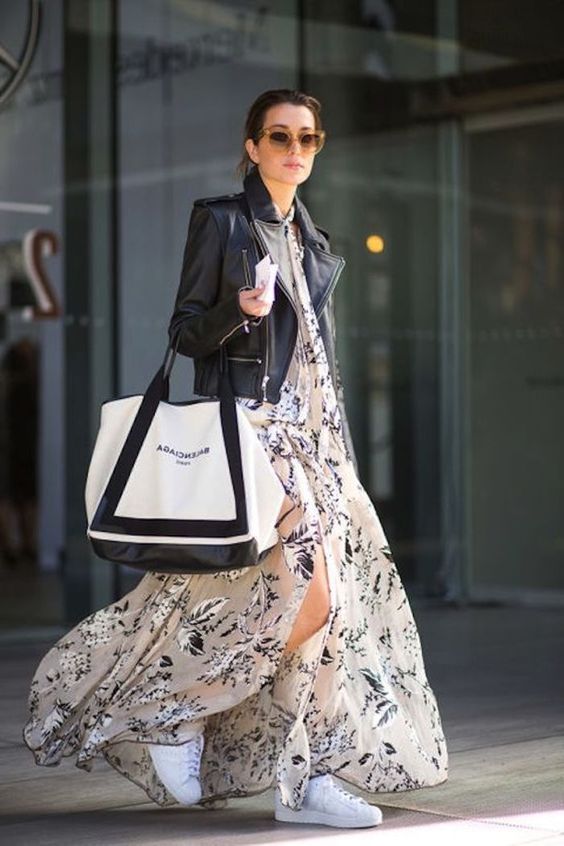 - avec une robe longue fluide pour twister l’image trop romantique (choisir des baskets pas trop volumineuses dans ce cas),