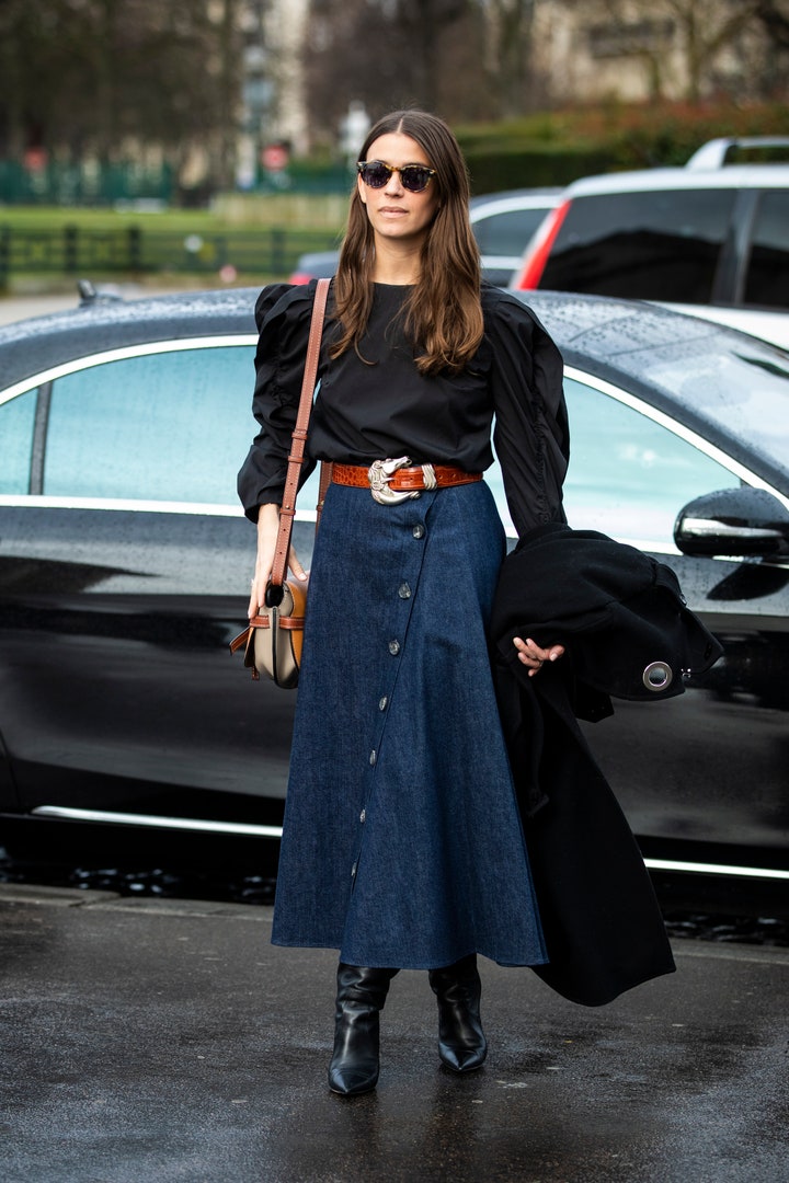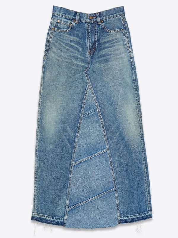 • la maxi jupe ou jupe longue. Ce sont tout particulièrement des modèles en denim et des coupes évasées que l’on va retrouver (idée d’up-cycling ci-dessous : la jupe Saint Laurent nous montre que l’on pourrait créer une jupe similaire en partant d’un vieux jean, en associant d’autres morceaux de denim pour créer un patchwork)